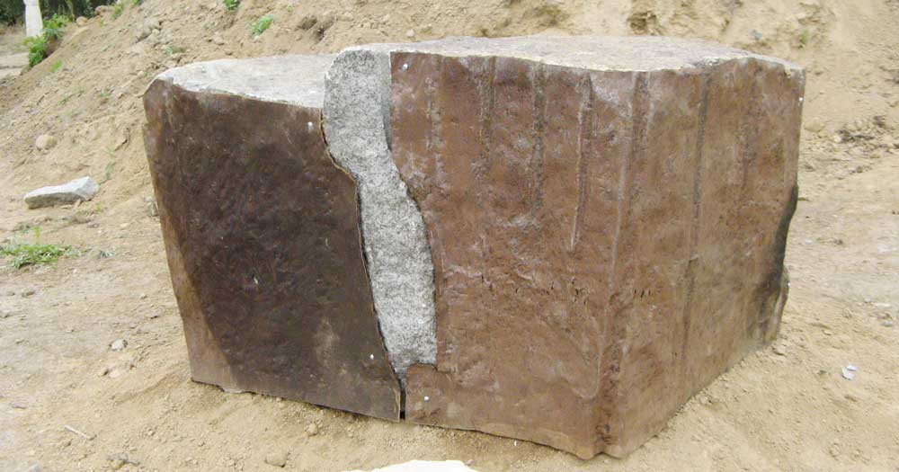 Die Pyramide. Senkrechte, 3-seitige Pyramide an der Basis mit 60 cm Seitenlänge, Höhe mit Edelstahlspitze 87 cm. Stein: Anatexit
