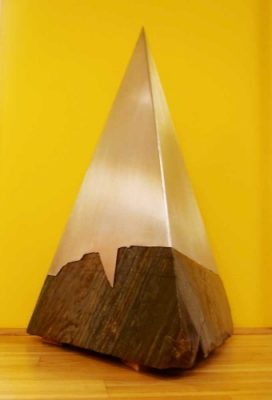 Die Pyramide. Senkrechte, 3-seitige Pyramide an der Basis mit 60 cm Seitenlänge, Höhe mit Edelstahlspitze 87 cm. Stein: Anatexit