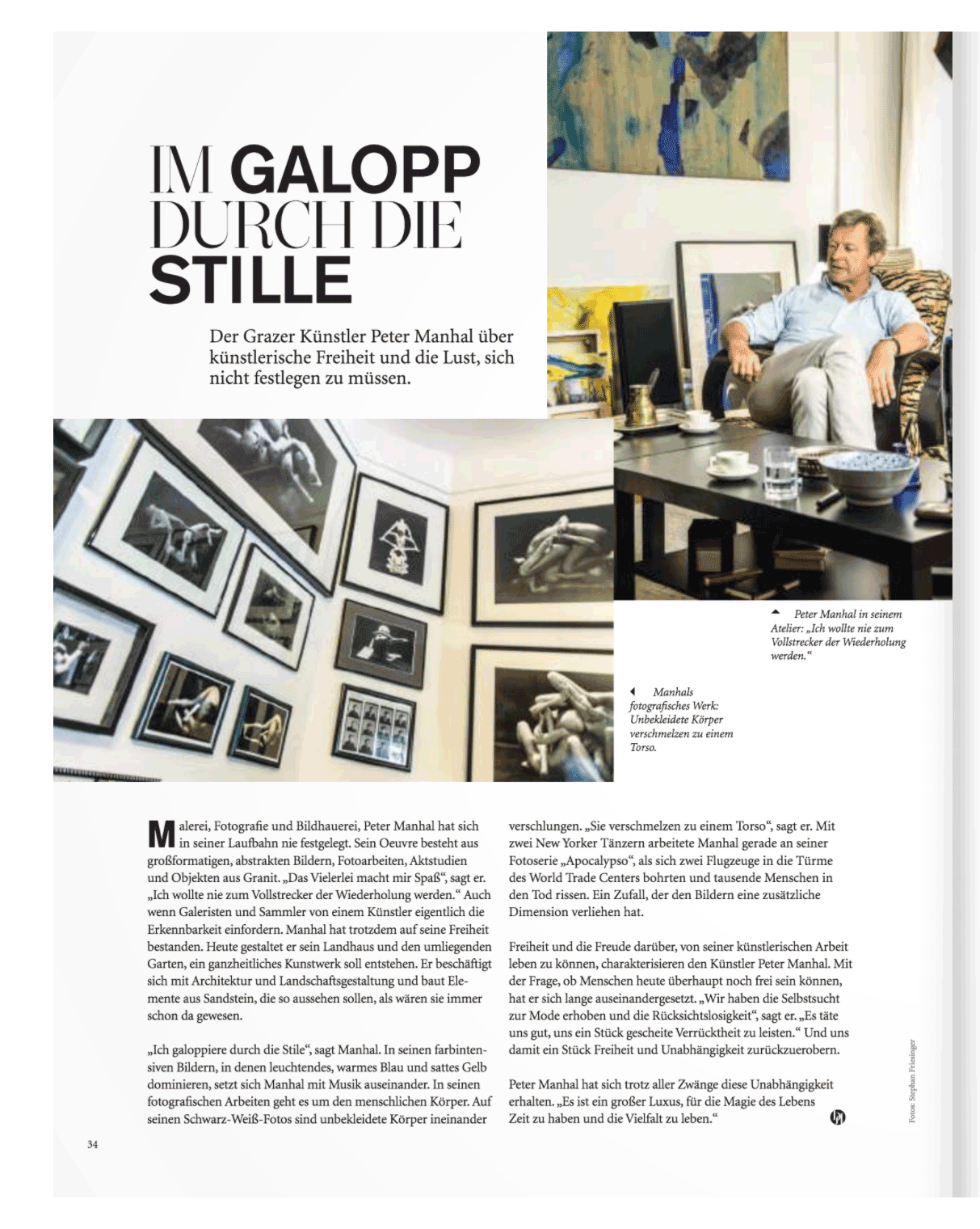 Malerei, Fotografie und Bildhauerei, Peter Manhal hat sich in seiner Laufbahn nie festgelegt. Sein Oeuvre besteht aus großformatigen, abstrakten Bildern, Fotoarbeiten, Aktstudien und Objekten aus Granit. „Das Vielerei macht mir Spaß“, sagt er. „ich wollte nie zum Vollstrecker der Wiederholung werden.“ Auch wen Galeristen und Sammler von einem Künstler eigentlich die Erkennbarkeit einfordern. Manhal hat trotzdem auf seine Freiheit bestanden. Heute gestaltet er sein Landhaus und den umliegenden Garten, ein ganzheitliches Kunstwerk soll entstehen. Er beschäftigt sich mit Architektur und Landschaftsgestaltung und baut Elemente aus Sandstein, die so aussehen sollen, als wären sie immer schon da gewesen.